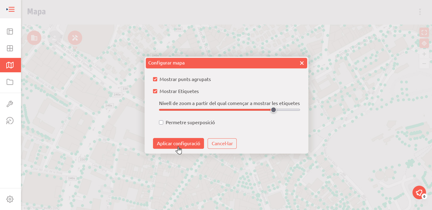 Además, se puede configurar el nivel del zoom a partir del cual se mostrarán los números de registro asociados a cada elemento, lo que facilita su identificación directa desde el mapa.