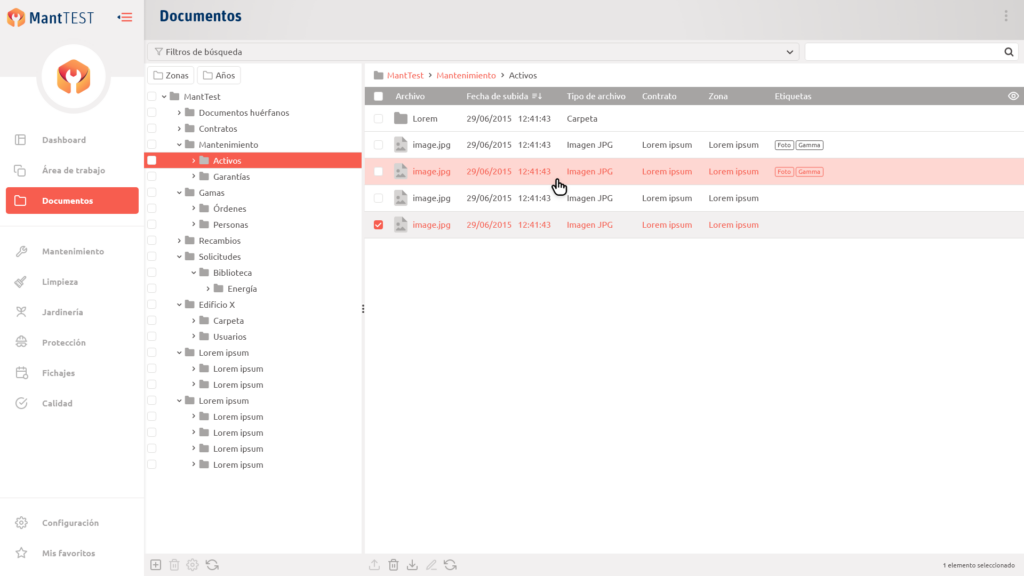 Toda la documentación generada queda centralizada dentro de la plataforma, estructurada de forma jerárquica y accesible según el perfil de usuario autorizado. Cada archivo puede ser clasificado mediante metadatos como etiquetas, tipo de documento, zona, contrato o fecha, lo que optimiza su trazabilidad y facilita su localización mediante búsquedas avanzadas y filtros combinados.