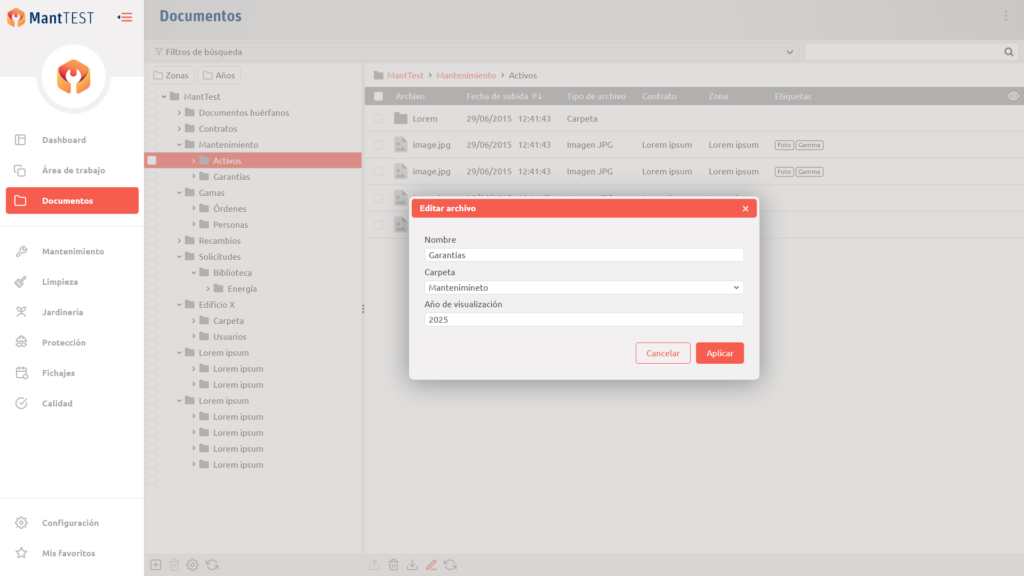 El Gestor Documental está totalmente integrado en MantTEST Web, lo que permite su uso en combinación con otras funcionalidades de la plataforma. Por ejemplo, se pueden asociar documentos a órdenes de trabajo, activos o solicitudes, garantizando una trazabilidad completa y una gestión más eficiente de la información en cada fase del servicio.
